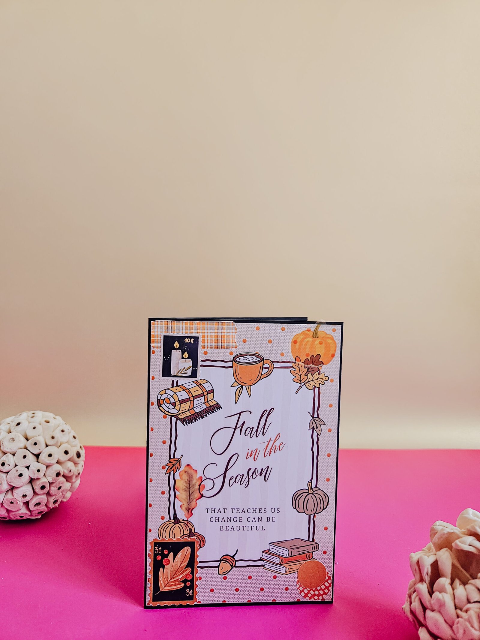 A little pocket of autumn, filled with warmth and calm.This card weaves together the most comforting elements of fall — stacked books, flickering candles, pumpkins, and soft blankets — creating a scene that feels like a quiet autumn evening.