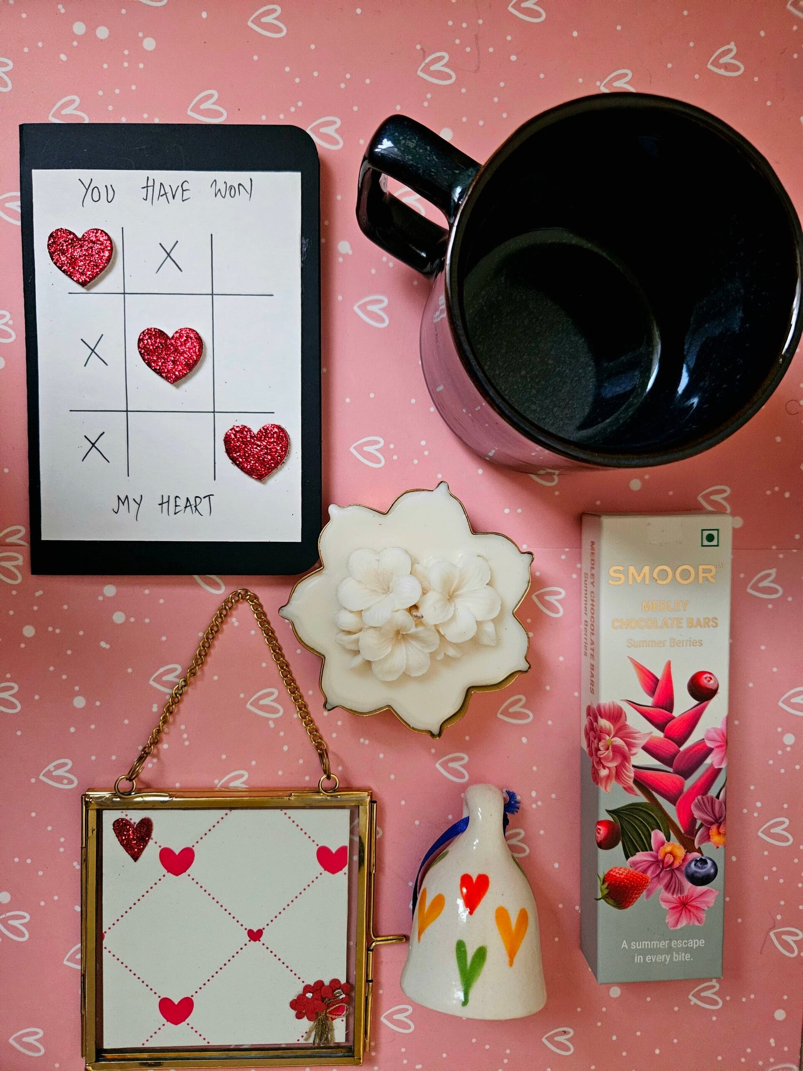 The dark velvet candle adds warmth and ambiance, while premium Smoor chocolates bring indulgence. A vintage frame and handcrafted card capture memories and feelings, and a delicate bell complimented by a mug made for everyday warmth.